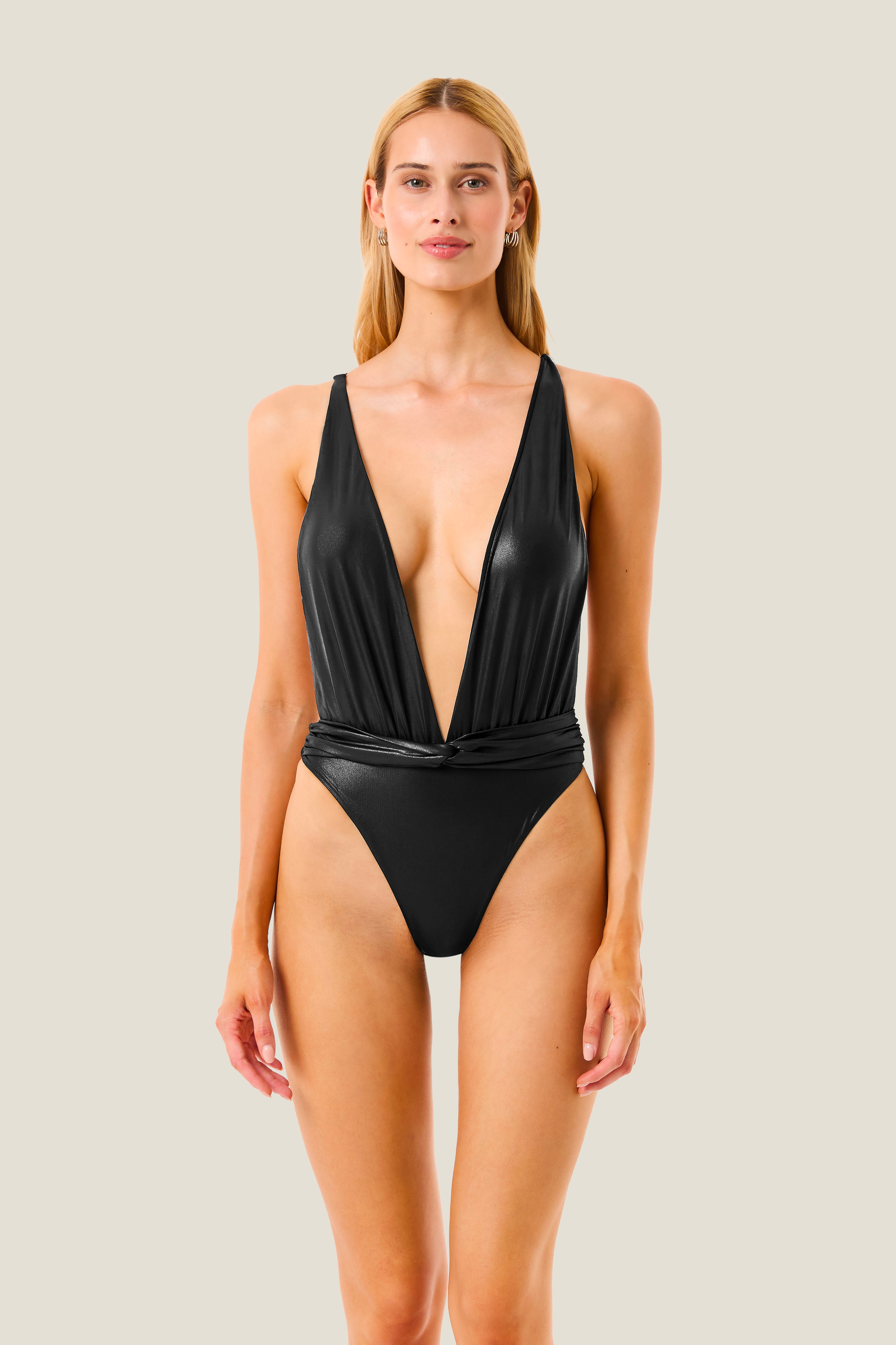 Intero in lycra laminata dal finish brillante, caratterizzato da una profonda scollatura frontale che crea un effetto elegante e sensuale. Il design presenta due fasce frontali che incorniciano il décolleté e si incrociano sul retro con laccetti fissi, assicurando stabilità e un look sofisticato. La fascia drappeggiata in vita valorizza la silhouette e definisce armoniosamente le linee del costume. Un modello glamour e scenografico, perfetto per chi desidera un look serale o da party beachwear dall’impatto ricercato.