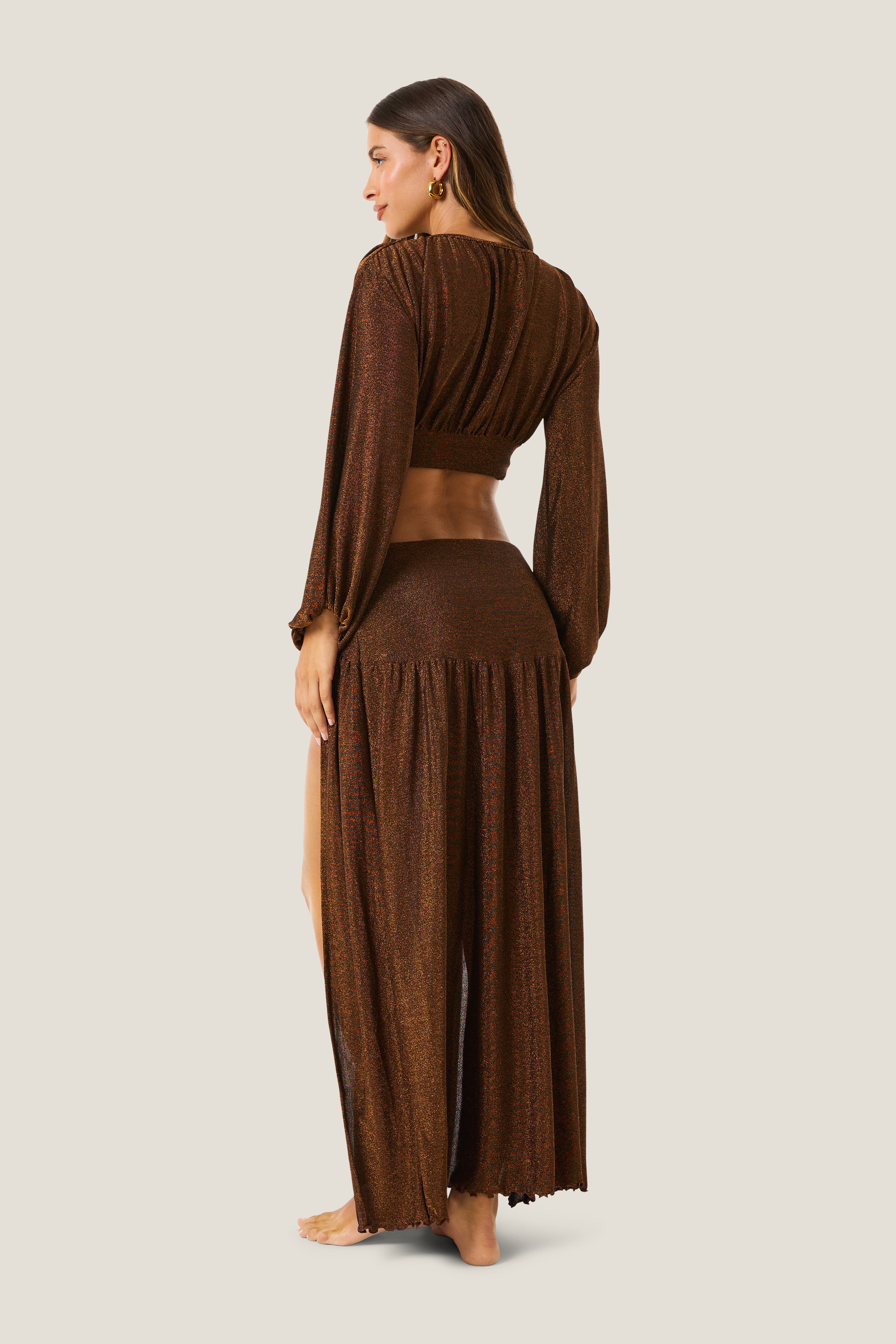 Gonna lunga donna con due spacchi Lurex Gloss, dal design elegante e luminoso, pensata per valorizzare la silhouette con stile contemporaneo. Realizzata in tessuto Lurex Gloss dall’effetto brillante, scivola sul corpo creando un movimento fluido e raffinato. I due spacchi aggiungono un tocco sensuale e moderno, esaltando la femminilità con leggerezza. Disponibile nelle varianti nero, bronzo e oro, è il capo ideale per look serali, resort o occasioni speciali.