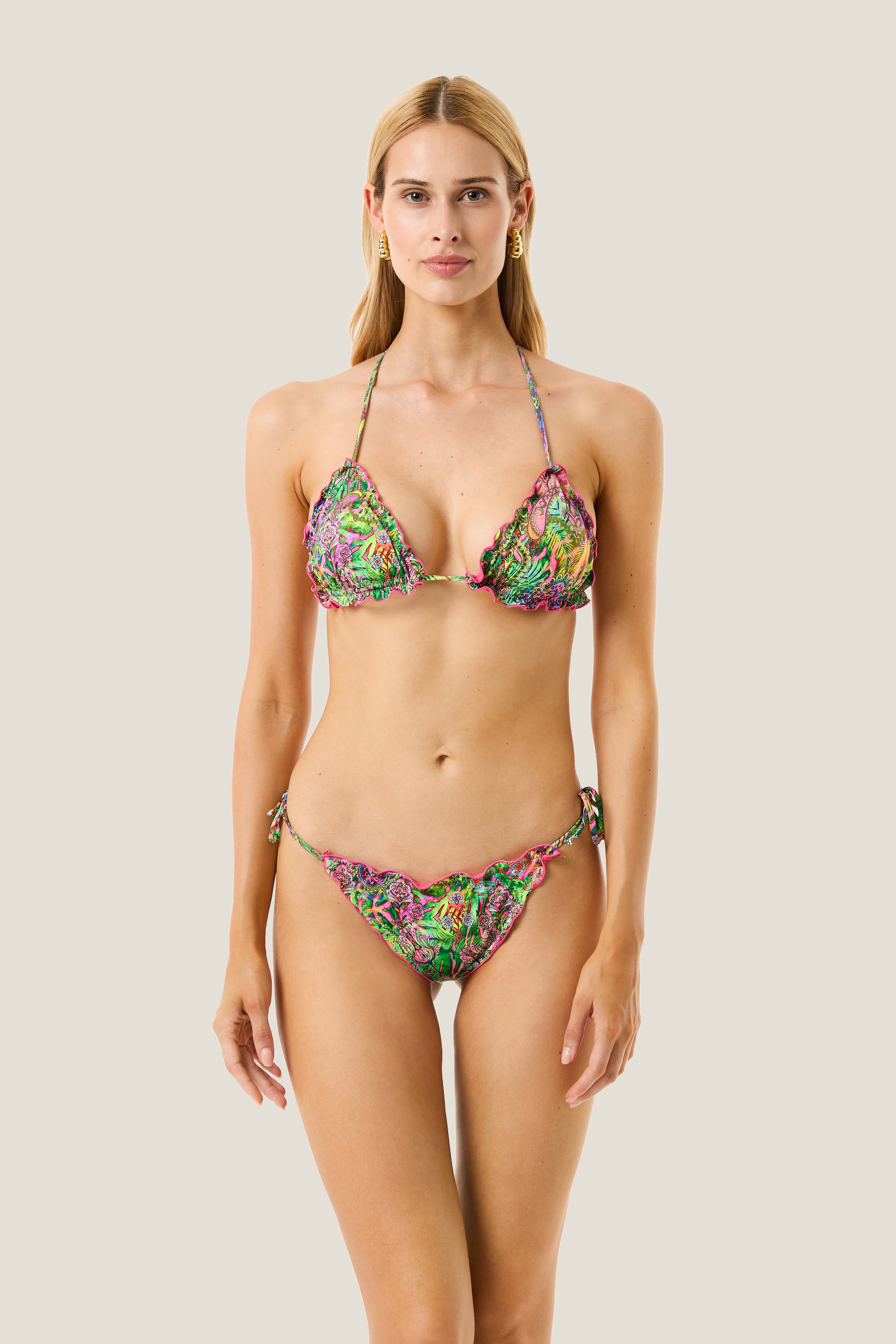 Bikini donna a triangolo con coppe estraibili, realizzato in lycra stampata con fantasia Karma Soul. Il bordo con sbambolatura fucsia esalta il décolleté con un tocco vivace e femminile, mentre i laccetti regolabili su collo e schiena consentono una vestibilità personalizzata e confortevole. Lo slip con laccetti laterali e finiture coordinate completa il look con armonia e delicatezza. Etichetta logo applicata sul retro.